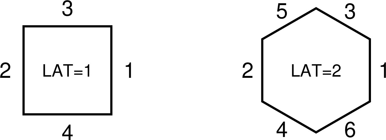 Lattice番号。LAT=1 の場合は四角柱、LAT=2 の場合は六角柱を定義します。これらを単位とした繰り返し構造を利用する場合に指定します。利用方法は 5.6.3 章 を参照してください。 |