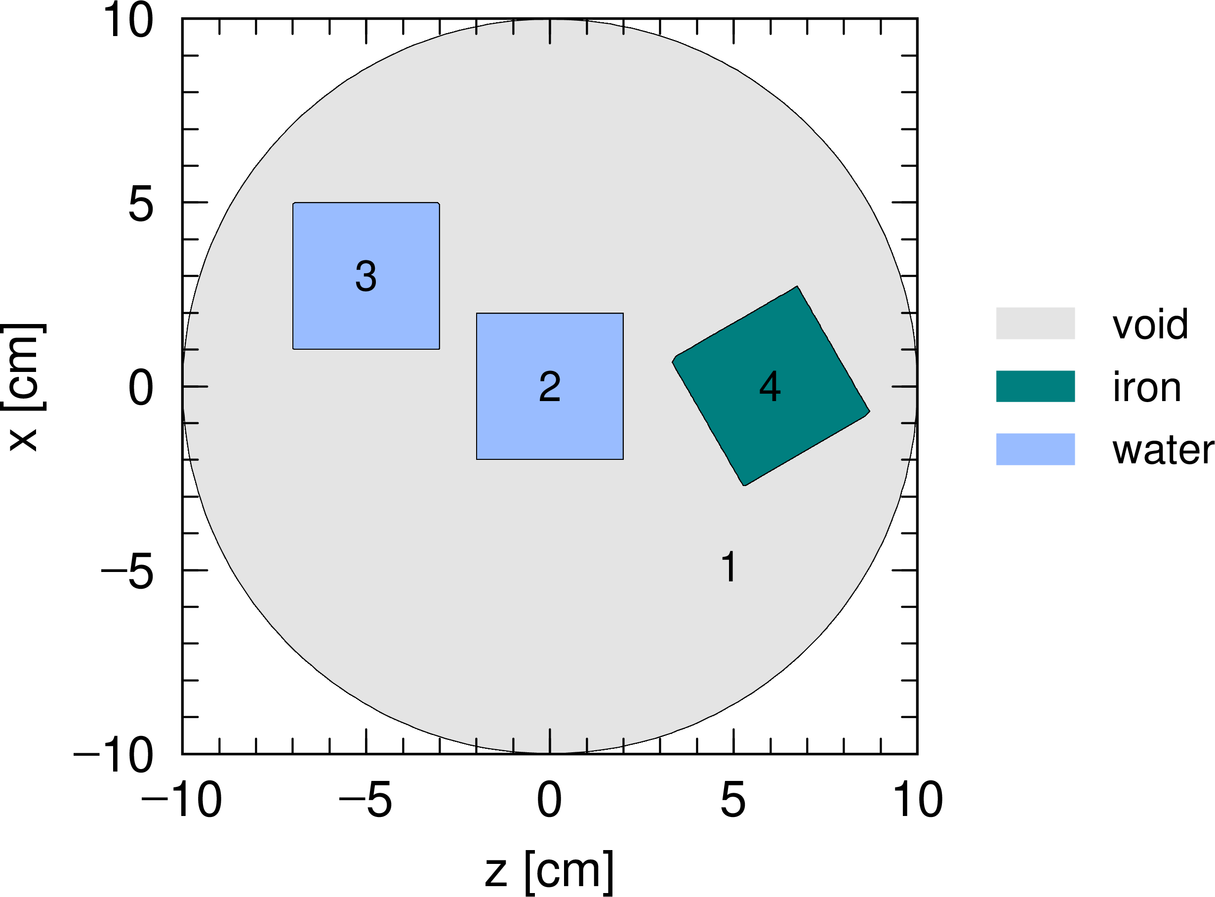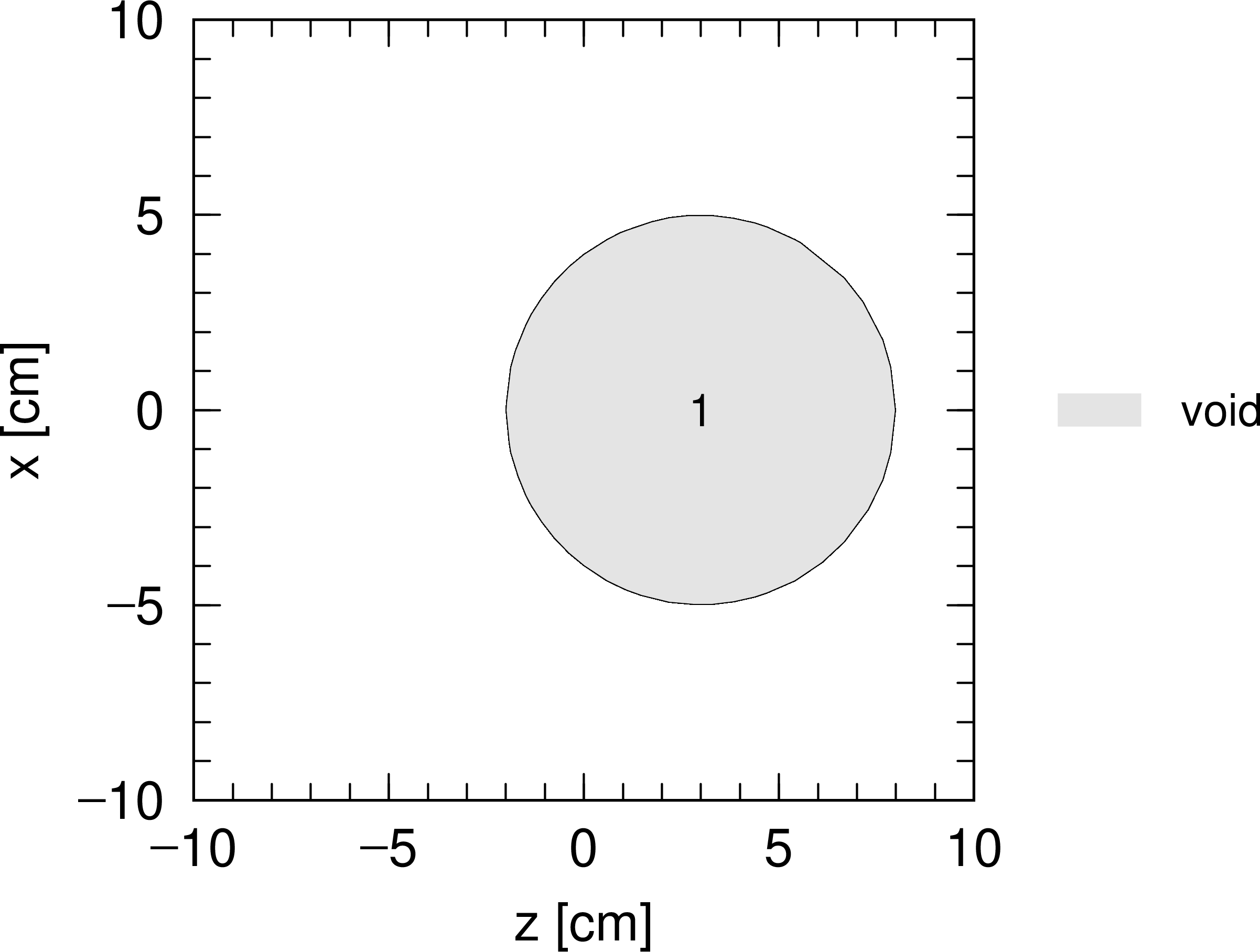 この例では、面番号10で中心 \((0,0,3)\)、半径5 cm の球面を定義しています。 5行目の SZ を用いて定義される面番号10の面は中心を \((0,0,3)\)、半径を 5 cm とする球面であるため、方程式は \(f(x,y,z)=x^2+y^2+(z-3)^2-5^2=0\) となります。 球の内はマイナス側、外はプラス側と定義されますが、これらは球の中心の座標 \((0,0,3)\) や球の外の適当な座標 \((0,0,10)\) を代入して、 \(f(0,0,3)=-25<0\)、 \(f(0,0,10)=24>0\) となることから確認できます。 [cell] セクションではこのような領域の区切り方を行った上で、必要に応じて各領域にセル番号を付与します。 例題(1)の2行目では、セル番号1のセルがボイド(真空)であることと、その領域が球面のマイナス側であることが定義されており、 図 5.6.1 で示す仮想空間を構築します。 図 5.6.1 は、例題(1)でつくられる領域を \(xz\) 平面で切った断面図として見たものです。本来は球ですが、2次元平面で見た結果円となっています。 例題(1)の3行目では外部ボイドが明示的に定義されており、そのセル番号を2と指定しています。