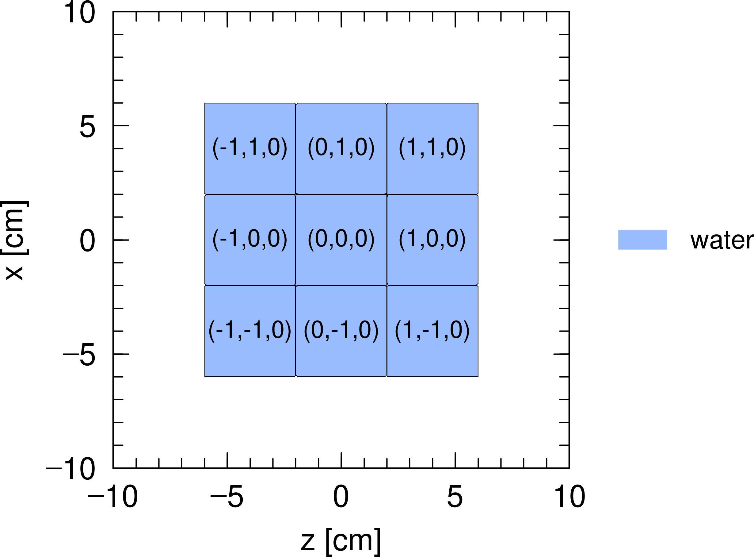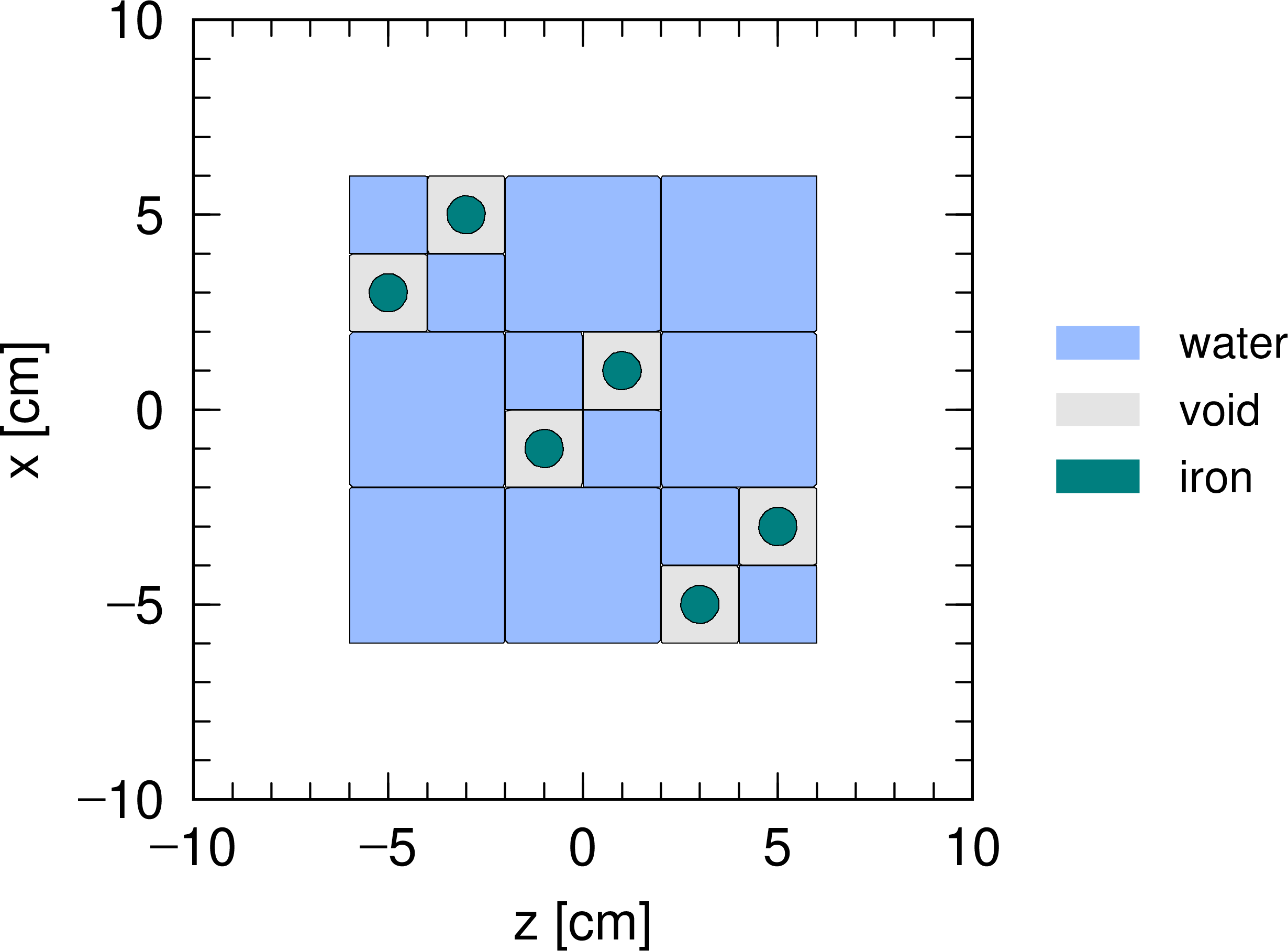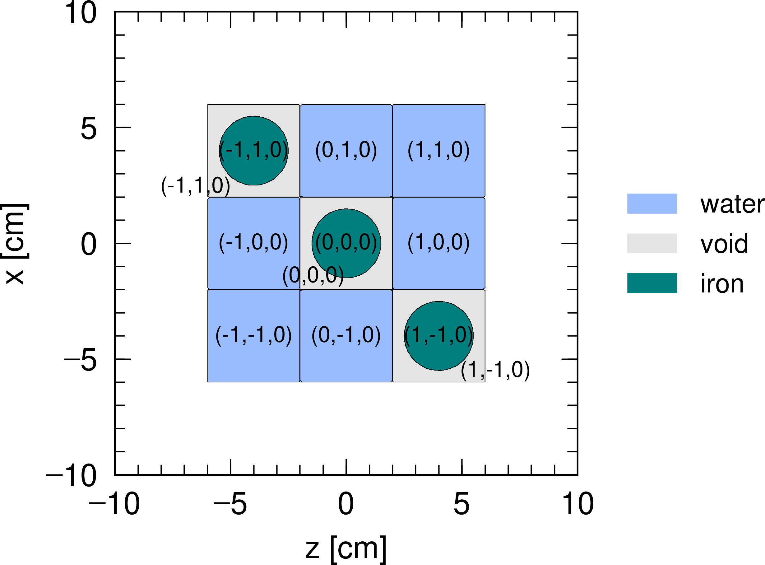 この例題でつくられる仮想空間は、 図 5.6.17 のようになります。ただし、 \(xz\) 平面で切った断面を示しています。まず、一辺12 cmの立方体を9つの四角柱に分け、そのうちの3つに内部構造をもたせた点は例題(9)と同じです。違うのは universe 3 として定義した宇宙を更に内部構造をもった格子で埋めたことで、9から11行目でその状態を指定しています。ここでは \(2\times2\times1=4\) の四角柱を定義しており、そのうちの2つが鉄柱をもつ格子となっています。また、8行目の (1 0 1) は座標変換を表しており、引用する際に universe 3 を \(x\) 軸方向に1 cm、 \(z\) 軸方向に1 cm平行移動しなさい、という意味となります。セル番号301は、原点 \((0,0,0)\) を中心にもつ四角柱を基本単位としているため、図のような配置にする場合は少しずらす必要があります。また、lattice を用いて階層構造を作成した場合の mesh=reg による領域指定は、階層構造を増やした書式により行います。例えば 図 5.6.17 において \(x=-1, z=-1\) を中心とする微小四角柱のボイド部分は、 (402 < 301[-1 -1 0] < 101[0 0 0] < 1) と記述します。もし対象とする階層が更に深くなった場合は、 < と lattice 座標を用いて階層を増やすことで各領域を指定できます。この書式の詳細については 06章「タリー形式」の領域メッシュの節を参照してください。