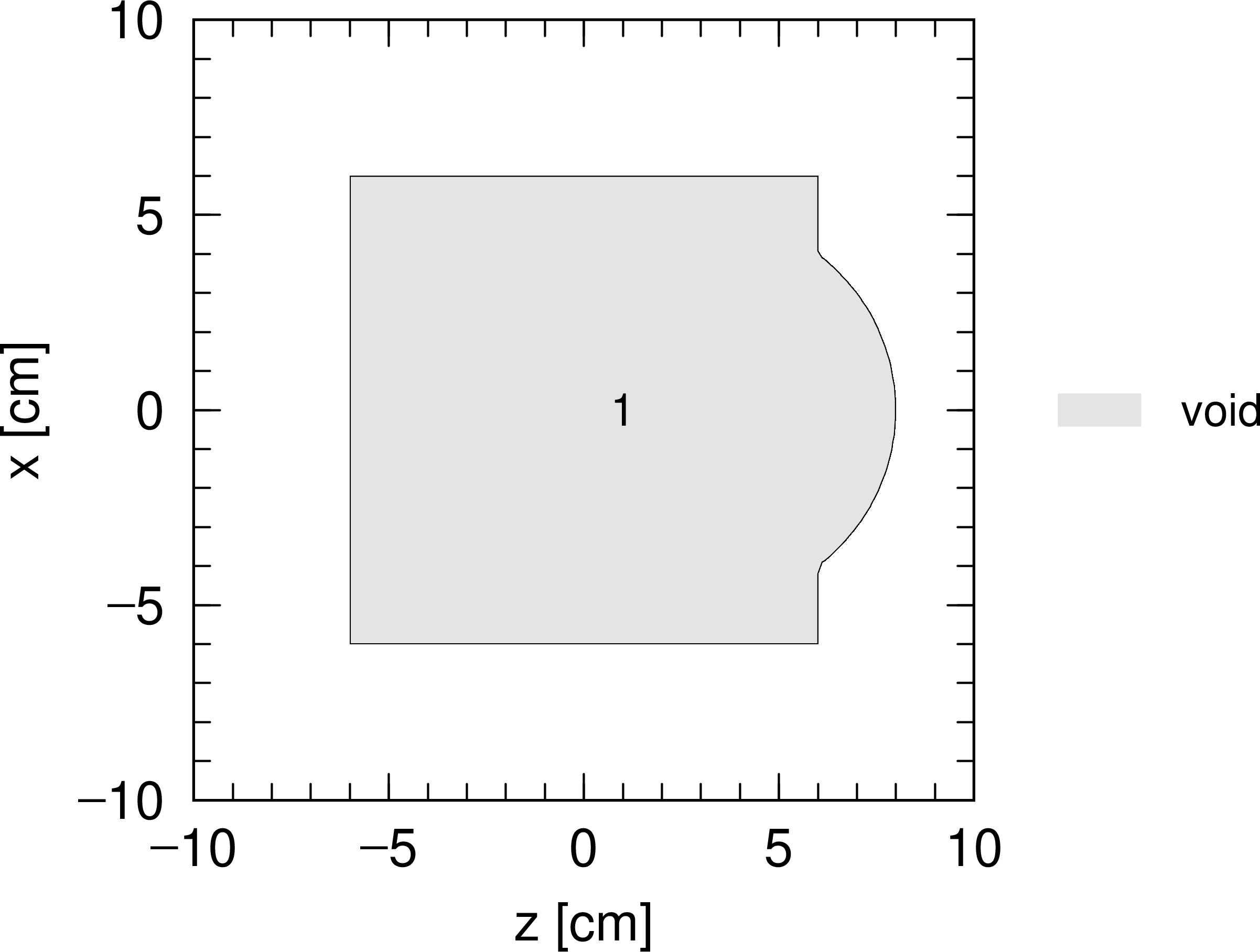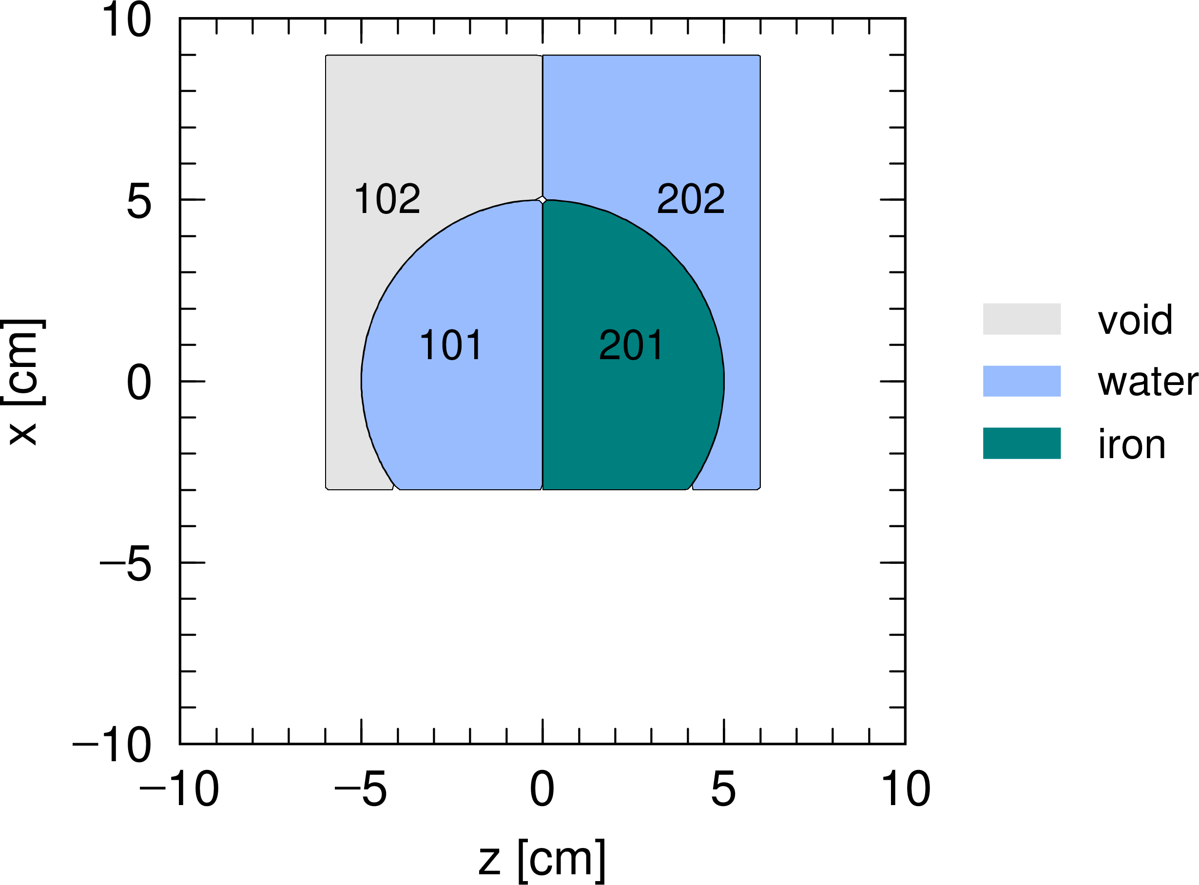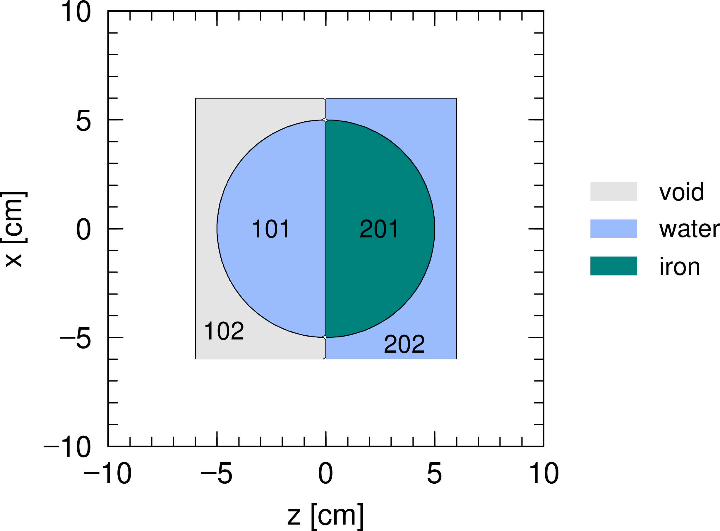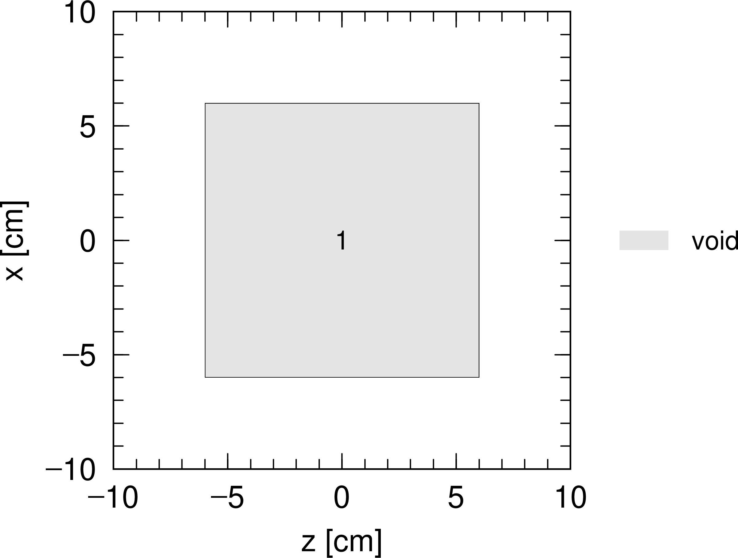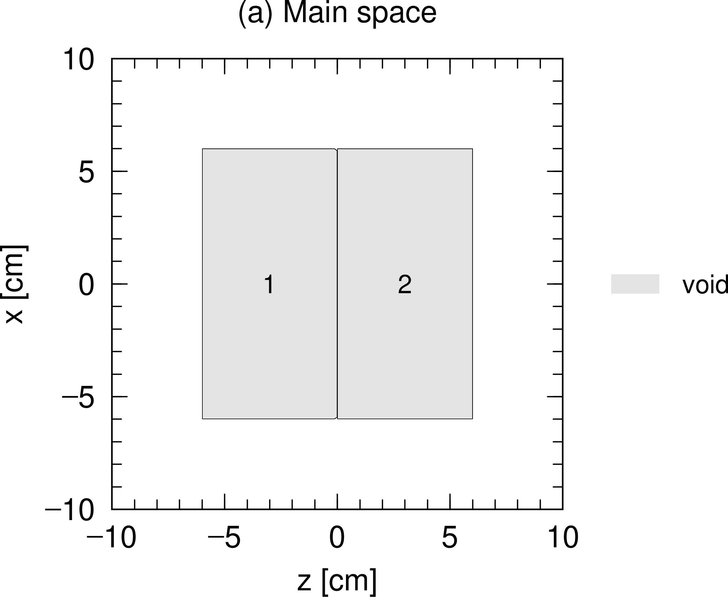 図 5.6.2 例題(2)の空間を \(xz\) 平面で切り取った断面図。セル番号1の領域はボイド(真空)。¶
