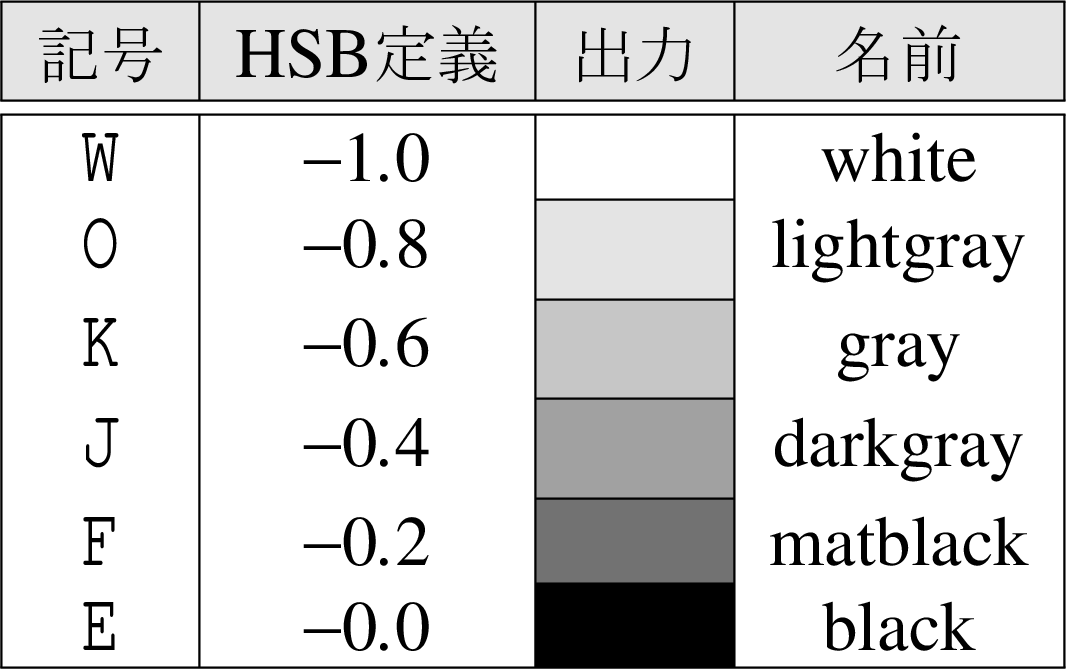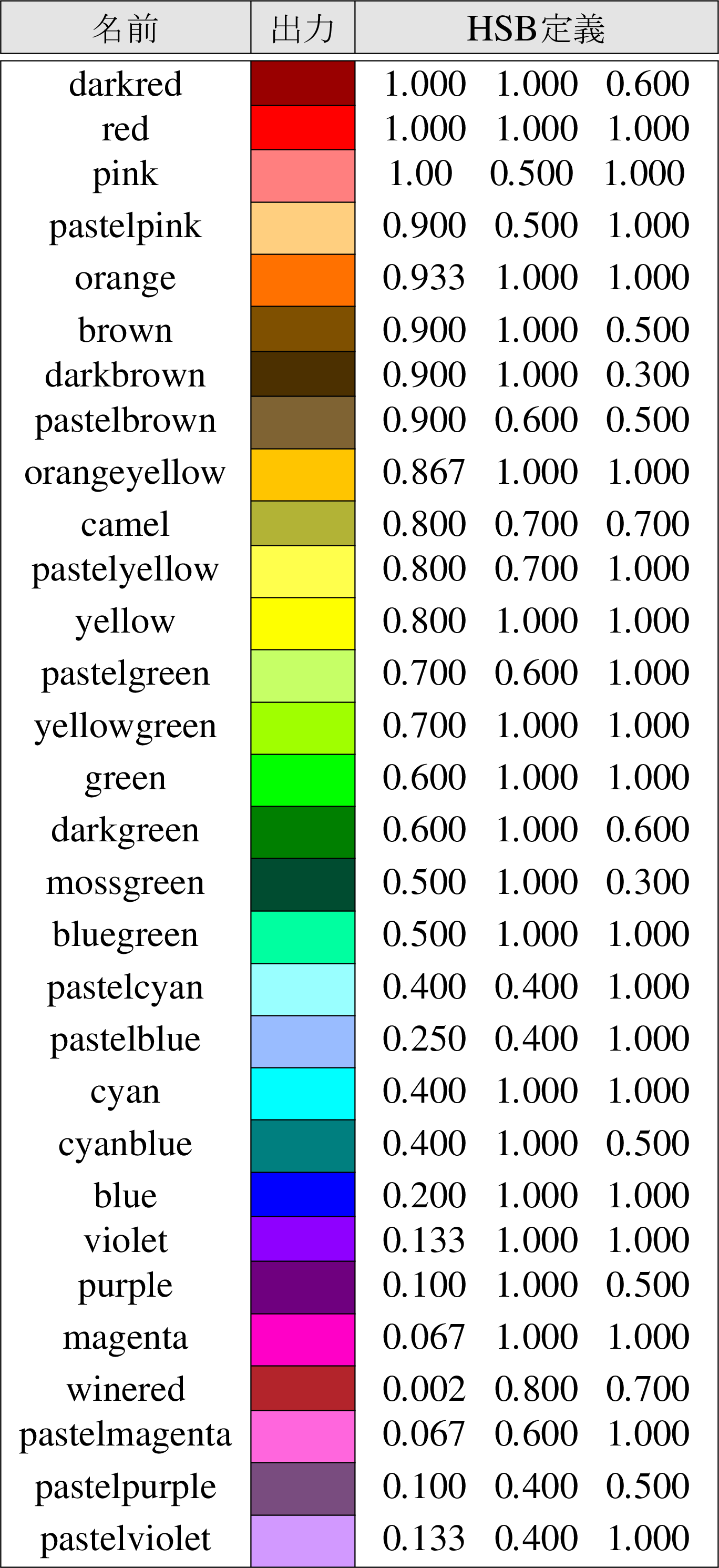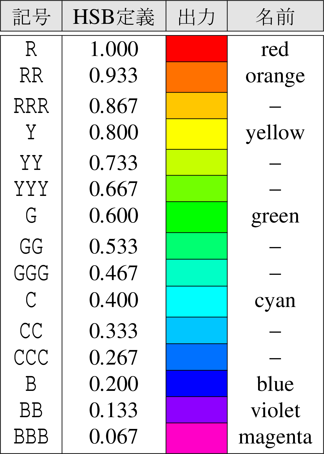 以下に、色指定の記号、名前、HSB数値の表を示します。 なお、名前の入力は小文字で行ってください。