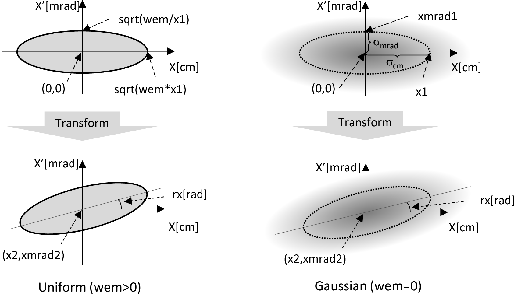 一方、 wem > 0 の場合は、 \(x=\sqrt{wem \cdot x1}\) と xmrad \(=\sqrt{wem/x1}\) と \(\pi\) の積で表される位相空間上の楕円の中に、発生線源のすべてが一様に収まるような分布の線源となります。