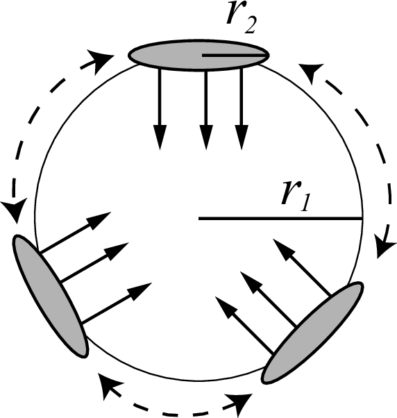 図 5.3.2 dir=isoの場合のイメージ図。ただし線源発生位置は常に中心から半径 r1 の球面上となります。¶