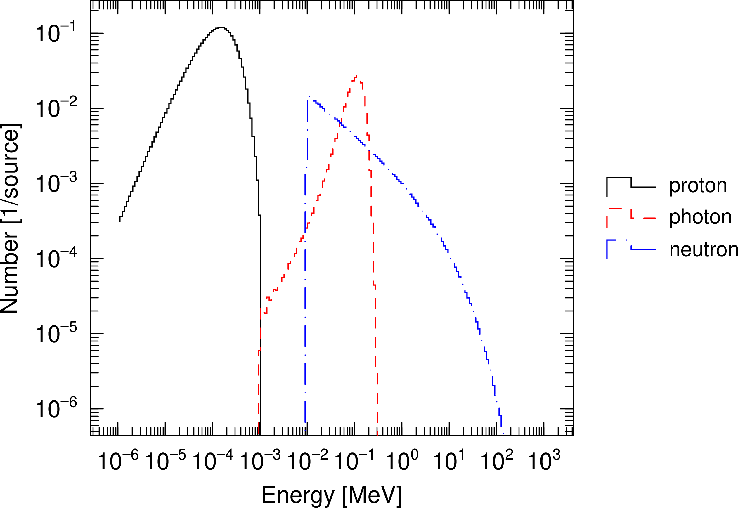 次に、3つのソースは、ソース粒子が、陽子、光子、そして中性子である。それぞれエネルギー分布が関数で定義してある。 最初のものは、Maxwell分布、次がガウス分布、最後が任意の関数である。最初のMaxwell分布は、e-type=7の