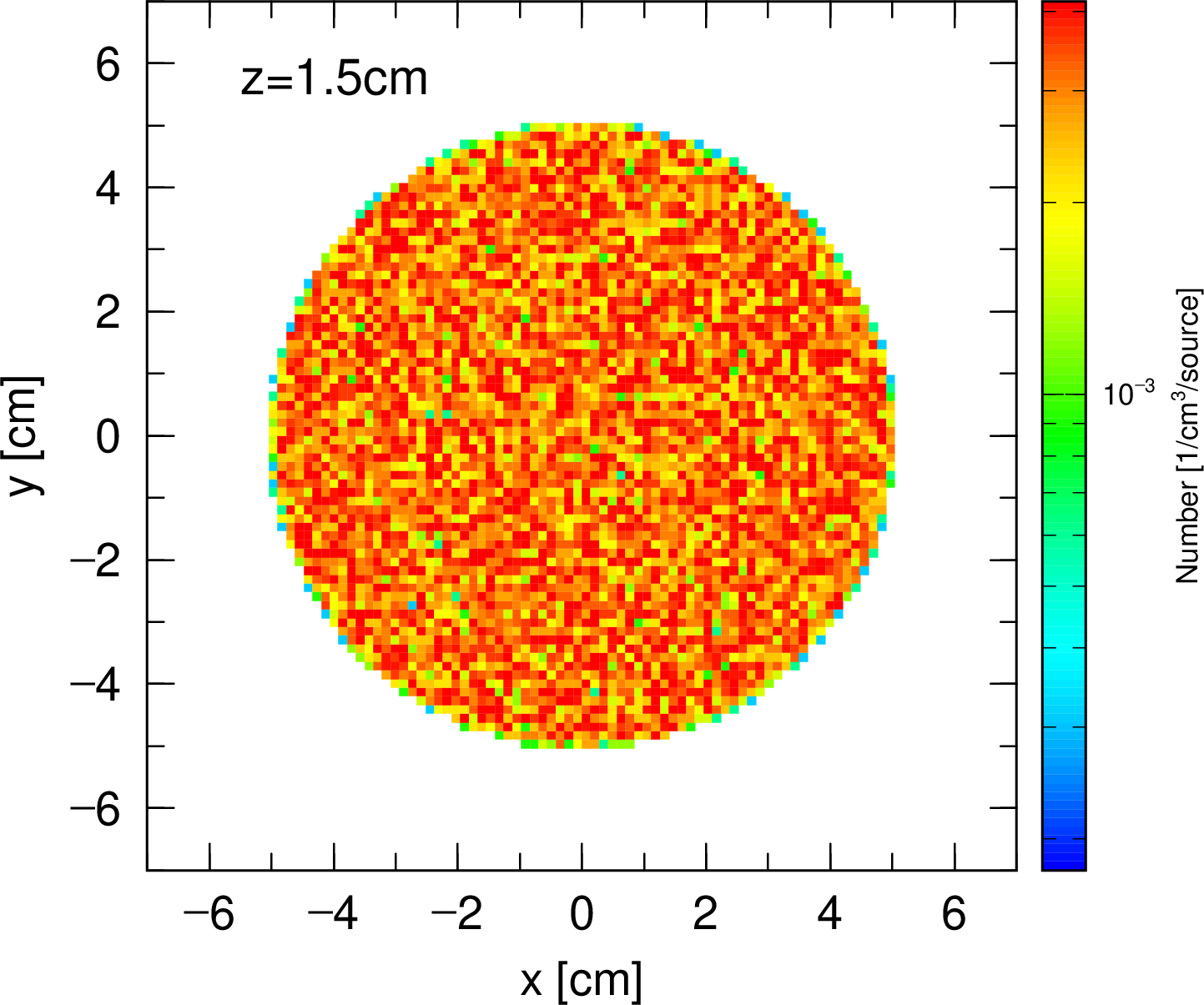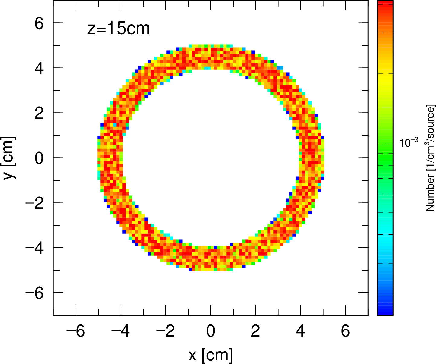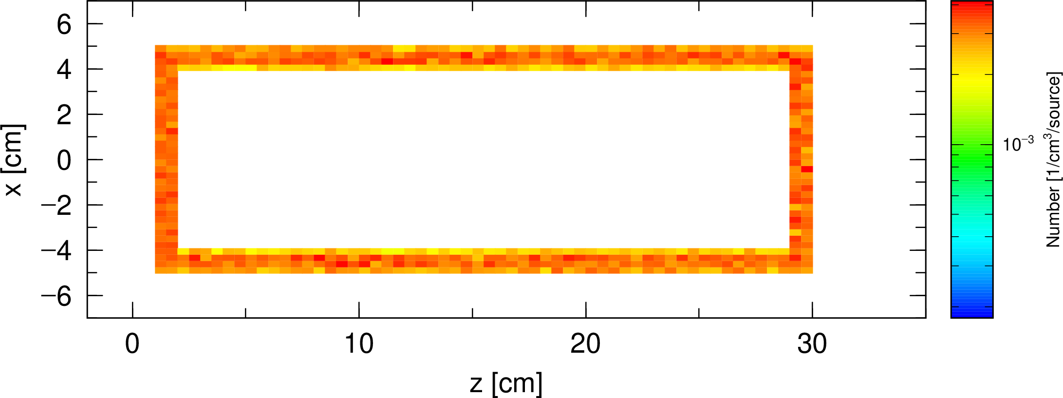 この例題には、3つの <source> で始まるソースが含まれる。 最初のソースは、円柱で \(z\) が 2 cm から 29 cm で、半径が 5 cm、ただし、r1 = 4 が定義してあるので、半径 4 cm の内側は含まれていない。 中空の円柱ソースである。 次のソースは、やはり円柱で半径 5 cm、 \(z\) が 1 cm から 2 cm までの厚さが 1 cm の薄い円柱である。 最後のソースは、前のと同じ薄い円柱で、 \(z\) 座標が 29 cm から 30 cm までである。 各ソースの <source> に定義される値は、各ソースの相対比である。 ここでは、各ソースの体積比になっている。 従って、このマルチソースでは、定義されるソース領域に均一に粒子が生成される。 この座標分布を [t-product] で output = source, icntl = 6 で計算したものを以下に示す。 このソースは、円柱の表面、厚さ 1 cm の領域を定義している。