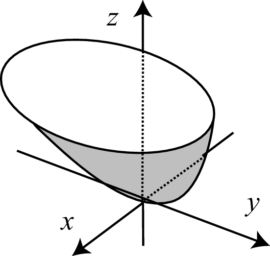 面記号 GQ は、 \(x,y,z\) の2次式で表現される曲面を定義する場合に使用します。 同様に2次式で表現される CX 等、 KX 等、 SQ との違いは、中心軸が \(x,y,z\) 軸と平行でない曲面に対しても定義できる点です。 ただし、単純な1次変換であれば、 CX, KX, SQ 等で定義した面に対して [transform] セクションで定義した座標変換を適用する方が便利です。 リスト 5.5.9 では、 リスト 5.5.8 で取り扱った放物面を \(y\) 軸回りに \(30^\circ\) だけ回転させた例を示しており、 図 5.5.9 のような面を定義できます。 この例題で指定した面定義数値は、下記の計算により求めたものです。 座標 \((x,y,z)\) を \(y\) 軸周りに \(\theta\) 回転させた座標を \((x',y',z')\) とすると、これらの関係は、