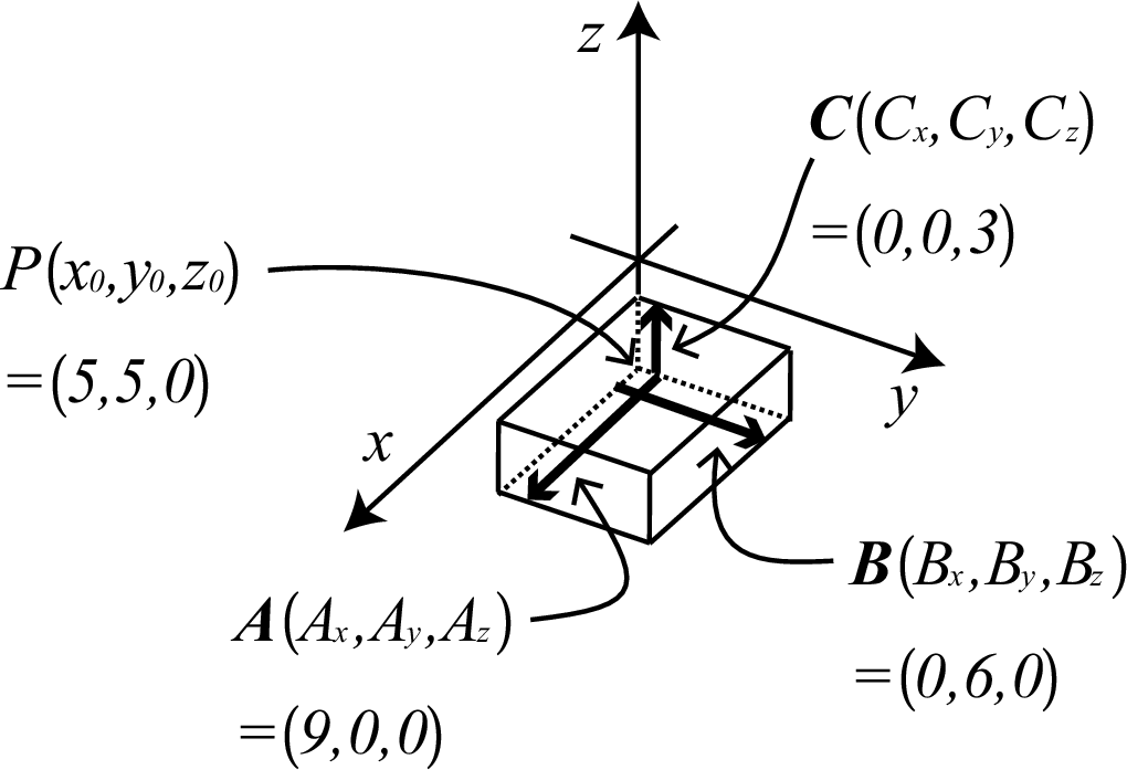 任意の直方体の面を定義する場合は、面記号 BOX を指定します。 面定義数値には、基点の座標 \(P(x_0,y_0,z_0)\) と、直方体を形作る3つのベクトル \(\mathbf{A}(A_x,A_y,A_z)\), \(\mathbf{B}(B_x,B_y,B_z)\), \(\mathbf{C}(C_x,C_y,C_z)\) の各成分を指定します。 これらの関係は 図 5.5.11 のようになります。 リスト 5.5.11 では、点 \((5,5,0)\) を頂点の1つとし、 \(\mathbf{A}=(9,0,0)\), \(\mathbf{B}=(0,6,0)\), \(\mathbf{C}=(0,0,3)\) の3つのベクトルが示す方向に広がった直方体の面を定義しています。 任意の直方体の面を定義する際、 \(\mathbf{A},\mathbf{B},\mathbf{C}\) は \(x,y,z\) 軸に平行である必要はありませんが、各々のベクトルの関係は垂直である必要があります。
