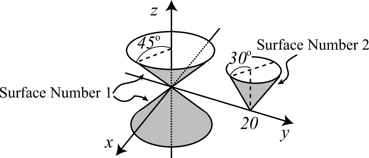 となります。 この場合、面番号1の面は、円錐の頂点を \((0,0,0)\) とし、 \(z\) 軸を中心軸とする円錐面となり、 図 5.5.5 の左側に示す面のようになります。 これらはそれぞれ面定義数値の最後に \(k=1\) あるいは \(k=-1\) を指定することで定義できますが、例題の2行目では \(k\) を未指定としており、この場合は両方の面を定義することになります。 また、面定義数値の2番目は、円錐の中心軸と母線のなす角度 \(\theta\) と \(|t|^2=\tan^2\theta\) の関係にあります。よって、面番号1の場合は \(\theta=45^\circ\) となります。 次に、 \(x,y,z\) 軸に平行な中心軸をもち、座標 \((x_0,y_0,z_0)\) を頂点とする円錐面を定義する場合は、 K/X, K/Y, K/Z を指定します。 例題の3行目に、 K/Z を指定した例を示します。 頂点は \((0,20,0)\) であり、 \(z\) 軸に平行な中心軸をもつ円錐面を定義しています。 \(|t|^2=1/3\) であることから、 \(\theta=30^\circ\) となります。 また、 \(k=1\) とすることで、プラス側の円錐面のみを定義しています。 なお、 \(k=\pm1\) を定義した場合、斜め方向への回転ができなくなってしまいます。 そのような場合は、 \(k\) は定義せずに両側に広がる円錐面を定義した上で、別の面を定義して片側のみに広がる円錐面を表現してください。