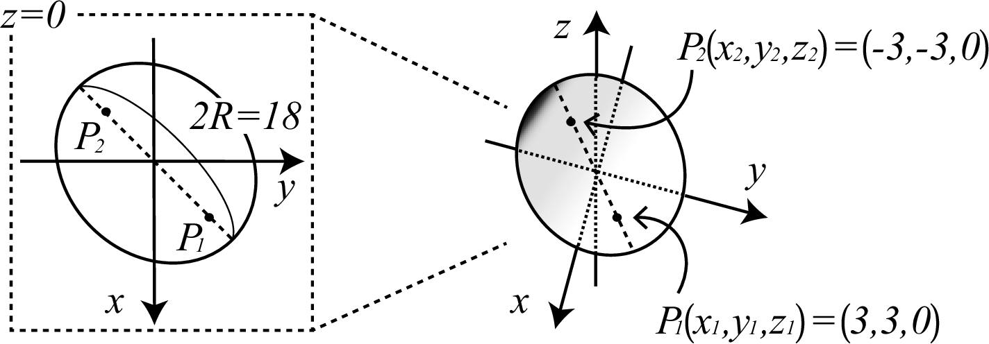 面記号 ELL を用いて、任意の位置に回転楕円体の面を定義できます。 楕円の焦点の座標や中心の座標を指定することで楕円を定義し、その楕円を長軸周りに回転させることで、楕円面を定義します。 ただし、この面記号は面定義数値の7番目に指定する \(R\) の符号によって、1から6番目に指定する値の意味が変わります。 リスト 5.5.18 では \(R\) が正の場合を扱っており、この場合は、楕円を形作る2つの焦点と長軸の半径を指定します。 面定義数値の1,2,3番目で楕円の第1焦点の座標 \(P_1(x_1,y_1,z_1)\) を与え、4,5,6番目で第2焦点の座標 \(P_2(x_2,y_2,z_2)\)、7番目の値 \(R\) には長軸の半径を与えます。 図 5.5.18 の右側に示したのが、 リスト 5.5.18 により定義された楕円面です。 楕円の第1,2焦点の座標はそれぞれ \(P_1=(3,3,0)\), \(P_2=(-3,-3,0)\) としており、 \(xy\) 平面上に定義しています。 また、長軸の方向は \(xy\) 平面上で \(x\) 軸から \(45^\circ\) 傾けた方向としており、 図 5.5.18 の左側に示すような楕円となっています。 長軸の長さは \(2R=18\) cmであり、この軸を回転軸とする回転楕円体の面が定義されます。