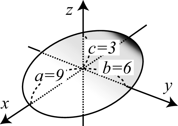 図 5.5.6 に示すような楕円面を定義する場合は、 SQ を指定します。 楕円面の方程式は、 \(x,y,z\) 軸方向の半径がそれぞれ \(a,b,c\) の場合に、