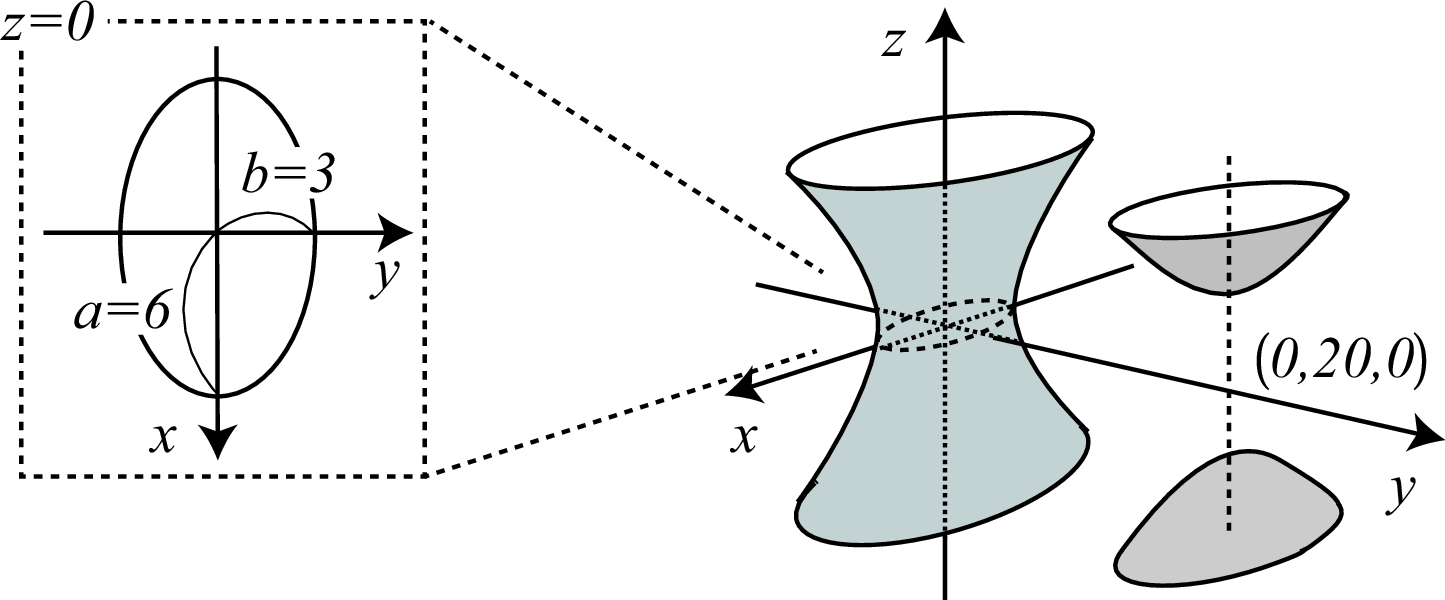 ただし、これらは \(z\) 軸を中心軸としたものです。 また、 \(a=b\) の場合は回転双曲面となります。 例題の2行目で定義している面番号1が、 図 5.5.7 の中央にある一葉双曲面となります。 面定義数値の1,2,3番目にそれぞれ \(A=1/6^2,B=1/3^2,C=-1/5^2\) を指定し、4,5,6番目には \(D=E=F=0\)、7番目には \(G=-1\) を指定しています。 中心軸は \(z\) 軸であり、面定義数値の8,9,10番目に \((0,0,0)\) を指定することで、中心軸が座標原点を通ります。 この双曲面と \(z\) 軸に垂直な平面の交線は楕円となります。 図 5.5.7 の左側に示したのが、 \(z=0\) の平面上で面番号1の面を見た図です。 \(x,y\) 軸方向の半径がそれぞれ \(a=6,b=3\) cm の楕円となっています。 例題の3行目で定義しているのが、 図 5.5.7 の右側に示す二葉双曲面です。 面番号1とは \(a,b,c\) の符号を逆転させており、面定義数値の4,5,6番目を0、7番目を \(G=-1\) とすることで、二葉双曲面を定義しています。 ただし、面定義数値の8,9,10番目において \((x_0,y_0,z_0)=(0,20,0)\) と指定することで、中心軸が \((0,20,0)\) を通過する面となっています。 また、二葉双曲面を用いて [cell] セクションで領域を定義する際は、座標 \((x_0,y_0,z_0)\) を含む領域がマイナス側、含まない方がプラス側となります。 図の右下にある双曲面の内側の領域もプラス側として指定することになりますので、ご注意ください。