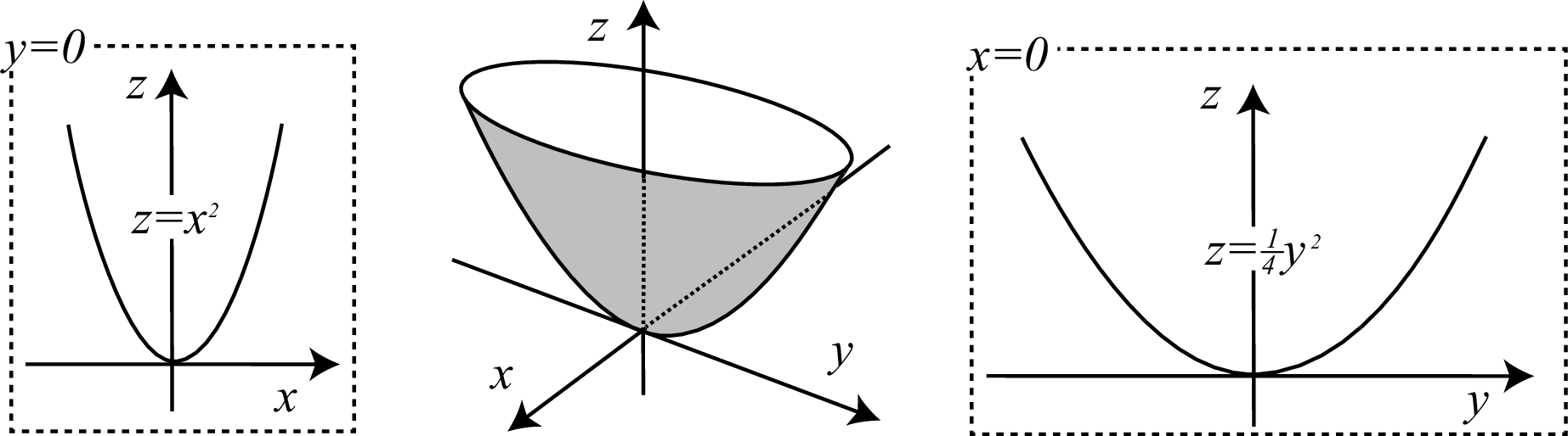 よって、面定義数値の1,2,3番目にそれぞれ \(A=1/a^2,B=1/b^2,C=0\) を指定し、4,5,6番目には \(D=E=0,F=-1\)、7番目には \(G=0\) を指定することで、 \(z\) 軸を中心軸とする放物面を定義できます。 例題では \(a=1,b=2\) の放物面を定義しています。 この放物面と \(z\) 軸を含む平面の交線は放物線となり、 \(y=0\) と \(x=0\) の平面上で見ると、それぞれ 図 5.5.8 の左側と右側に示す放物線となります。 また、放物面の頂点 \((x_0,y_0,z_0)\) は面定義数値の8,9,10番目で指定します。