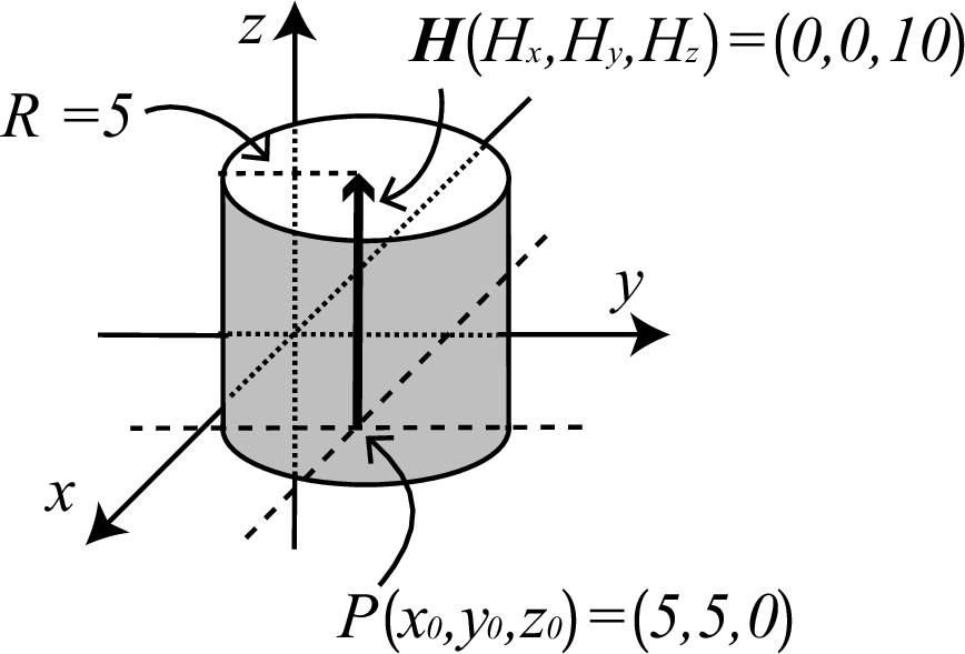 面記号 RCC を指定することで、円柱面を定義できます。 面定義数値として、円柱の底面の中心座標 \(P(x_0,y_0,z_0)\) の各成分、その点から上面中心へのベクトル \(\mathbf{H}(H_x,H_y,H_z)\) の各成分と半径 \(R\) を指定します。 これらの関係は 図 5.5.14 のようになります。 例題では、 \(P(5,5,0)\) を円柱底面の中心とし、上面中心へのベクトルを \(\mathbf{H}=(0,0,10)\)、半径を \(R=5\) cmとしています。 CX や C/X 等とは違い、 \(x,y,z\) 軸に平行ではない直線を中心軸とする円柱面を定義する際に便利です。