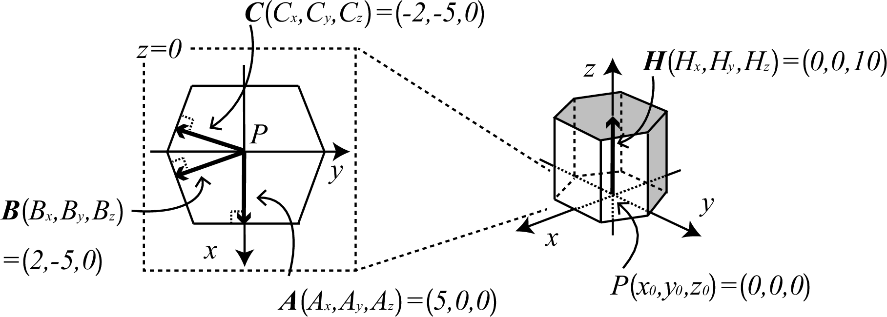 図 5.5.15 の右側に示すような六角柱の面を定義する場合は、面記号 RHP あるいは HEX を指定します。 面定義数値には、六角形となる底面の中心の座標 \(P(x_0,y_0,z_0)\) の各成分と、その点から上面中心へのベクトル \(\mathbf{H}(H_x,H_y,H_z)\) の各成分の他、六角形を定義するための3つのベクトル \(\mathbf{A}(A_x,A_y,A_z)\), \(\mathbf{B}(B_x,B_y,B_z)\), \(\mathbf{C}(C_x,C_y,C_z)\) の各成分を指定します。 六角形の中心 \(P\) と3つのベクトル \(\mathbf{A},\mathbf{B},\mathbf{C}\) の関係は、 図 5.5.15 の左側に示すようになります。 すなわち、点 \(P\) から六角形の連続する3つの辺に下ろした垂線の大きさと方向を3つのベクトルとして与えます。 リスト 5.5.15 では、原点を底面の中心とし、 \(z\) 軸方向に10 cmの高さをもつ六角柱の面を定義しています。 面定義数値の1,2,3番目には原点 \((0,0,0)\) の各成分を指定し、4,5,6番目では \(\mathbf{H}=(0,0,10)\) の各成分を指定しています。 7番目から15番目までは \(\mathbf{A},\mathbf{B},\mathbf{C}\) の \(x,y,z\) 成分をそれぞれ順番に指定し、 図 5.5.15 の左側に示す \(y\) 軸に関して対称な六角形を定義しています。