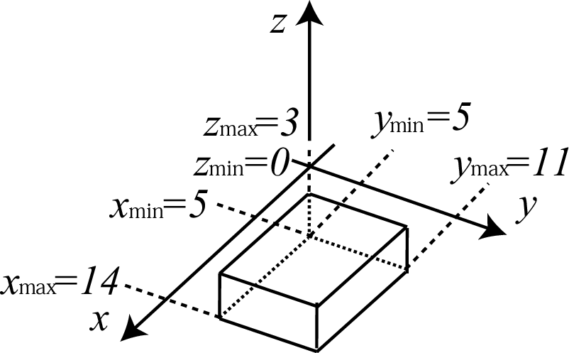 面記号 RPP は、 \(xy,yz,zx\) 平面に平行な各々2つずつの平面で囲まれる直方体の面を定義する場合に指定します。 よって、 BOX とは違い、各軸に対して任意の傾きをもつ直方体は定義できません。 面定義数値として、 \(x,y,z\) に関するそれぞれの最小値と最大値を与えます。 リスト 5.5.12 では、面定義数値の1から6番目に、 \(x_{\rm min}=5, x_{\rm max}=14\), \(y_{\rm min}=5, y_{\rm max}=11\), \(z_{\rm min}=0, z_{\rm max}=3\) を指定しており、 リスト 5.5.11 で定義したものと同じ直方体の面を定義しています。