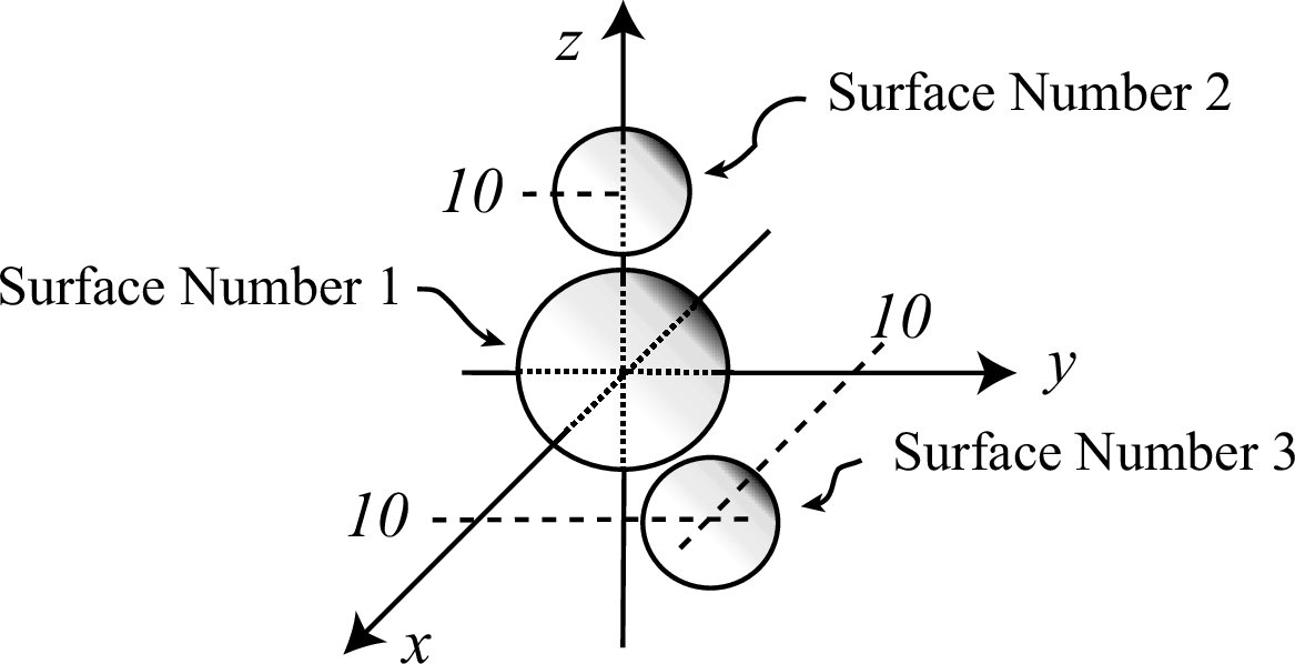 面記号 SPH を指定することで、任意の点を中心とする球面を定義できます。 面定義数値には、球の中心の座標 \((x_0,y_0,z_0)\) を1,2,3番目に指定し、球の半径を4番目に指定します。 リスト 5.5.13 では、点 \((5,5,5)\) を中心とし、半径を \(R=5\) cmとする球面を定義しています。 なお、任意の球面 S との違いはありません。