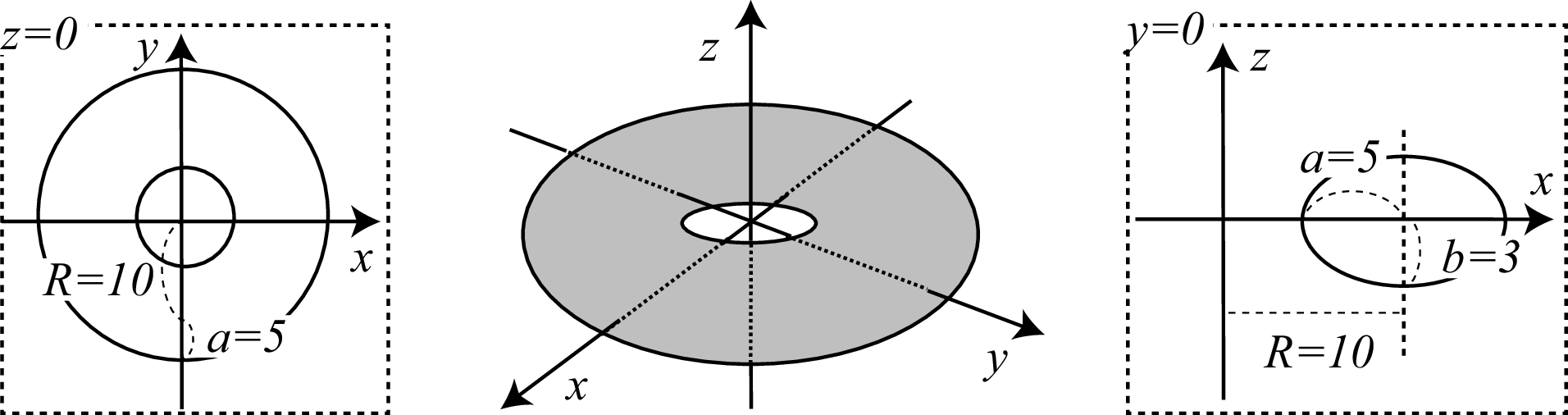と書くことができます。 この場合の楕円は長軸方向に \(2a\)、短軸方向に \(2b\) の大きさをもち、楕円の中心と回転軸の距離は \(R\) となります。 リスト 5.5.10 では楕円環体の中心を原点としており、面定義数値の1,2,3番目は全て0と指定しています。 面定義数値の4番目に \(A=R=10\) cm、5番目に \(B=b=3\) cm、6番目に \(C=a=5\) cmを指定することで、長軸方向に10 cm、短軸方向に6 cmの大きさをもつ楕円を \(z\) 軸から10 cm離れた位置で回転させた楕円環面を定義しています。 図 5.5.10 の左側に示したのが \(z=0\) の平面との交線です。原点と環の中心との距離は10 cm、環の大きさは \(5 \cdot 2 = 10\) cmとなります。 図 5.5.10 の右側に示したのが \(y=0\) の平面との交線です。ただし、 \(x\) 軸のプラス側のみ示しています。 環の断面図となっており、楕円が長軸方向に10 cm、短軸方向に6 cmの大きさをもっていることがわかります。