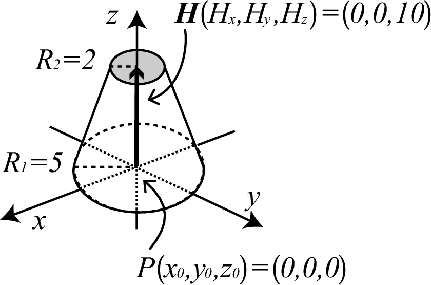 図 5.5.17 に示すようなカットされた円錐の面を定義する場合は、面記号 TRC を指定します。 面定義数値には、底面の中心の座標 \(P(x_0,y_0,z_0)\) の各成分と、その点から上面中心へのベクトル \(\mathbf{H}(H_x,H_y,H_z)\) の各成分に加えて、底面の円の半径 \(R_1\) と上面の円の半径 \(R_2\) を指定します。 リスト 5.5.17 では、原点を底面の中心とし、 \(z\) 軸方向に10 cmの高さをもつカットされた円錐の面を定義しています。 面定義数値の1,2,3番目には原点 \((0,0,0)\) の各成分を指定し、4,5,6番目では \(\mathbf{H}=(0,0,10)\) の各成分を指定しています。 底面の半径は \(R_1=5\) cm、上面の半径は \(R_2=2\) cmとしており、これらを面定義数値の7,8番目のそれぞれで指定しています。