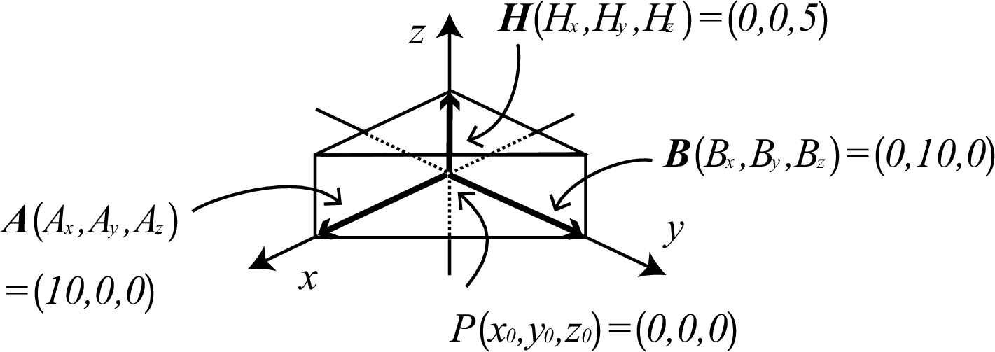 面記号 WED を用いて、 図 5.5.20 に示すようなくさび形の面を定義できます。 ただし、定義できるくさび形はその底面と上面が直角三角形となる三角柱のみです。 リスト 5.5.20 では、面定義数値の1,2,3番目で底面の1つの頂点の座標 \(P(x_0,y_0,z_0)=(0,0,0)\) を指定しており、これを始点とする2つのベクトル \(\mathbf{A}(A_x,A_y,A_z)=(10,0,0)\) と \(\mathbf{B}(B_x,B_y,B_z)=(0,10,0)\) を4,5,6番目と7,8,9番目で指定することで、直角三角形を定義しています。 面定義数値の10,11,12番目では、ベクトル \(\mathbf{H}(H_x,H_y,H_z)=(0,0,5)\) を指定しており、三角柱の高さを決定しています。