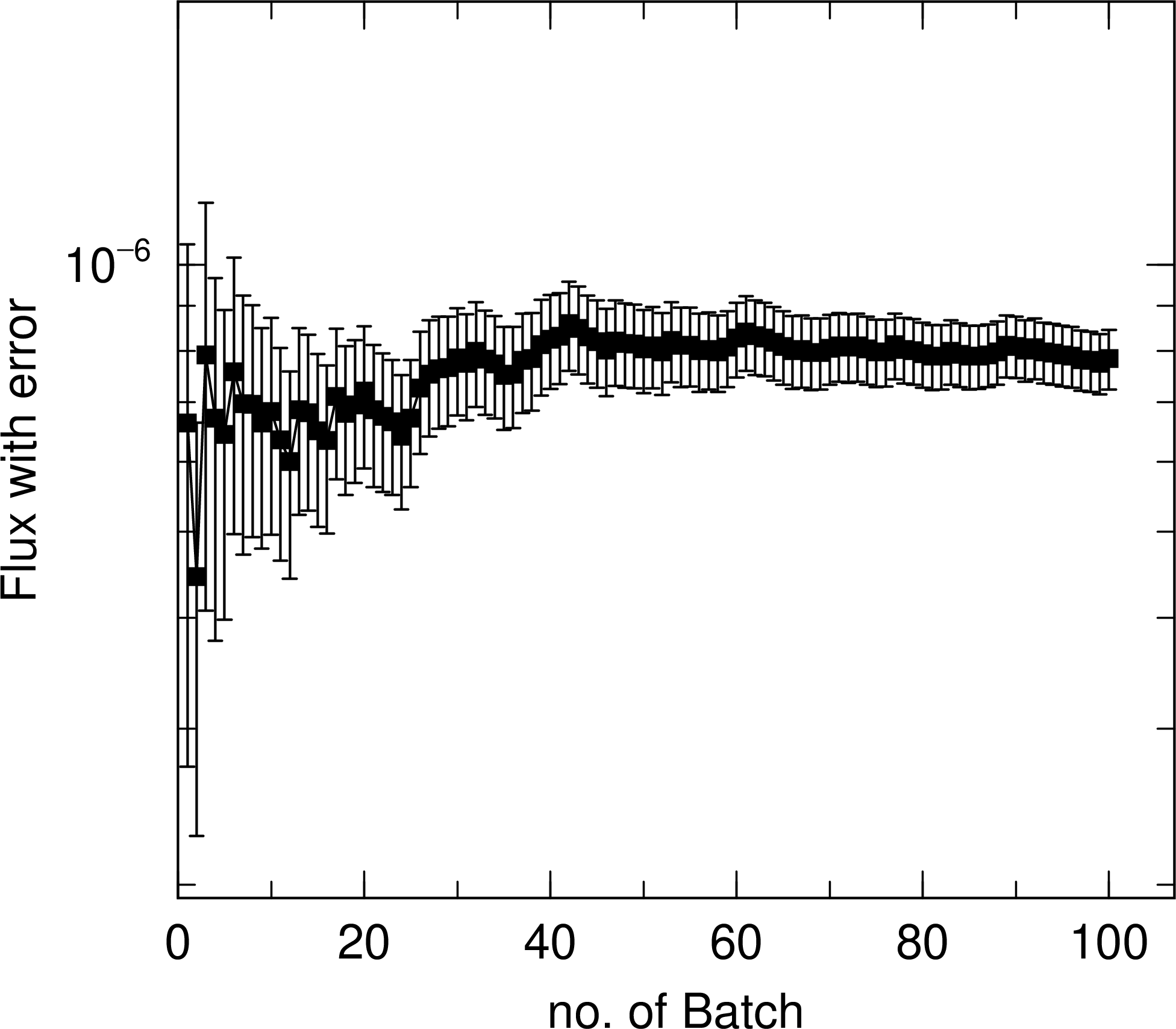 ヒストリー数に対する依存性は全ヒストリーの後半の結果から評価しており、例えば100バッチが終了した時は51から100バッチの時の値を使って評価します。平均値と FOM はヒストリー数依存性がない、すなわち一定値に収束することから、 \(f(N_{\rm batch})=aN_{\rm batch}+b\) の関数(ここで、 \(N_{\rm batch}\) は全バッチ数)を仮定して最小二乗法でフィッティングを行い、その係数 \(a\) が0に近いかどうかで判定します。具体的には、この係数を最終バッチ時の値で規格化した値の絶対値が0.05未満であれば yes とし、以上であれば no と判定します。統計誤差については、ヒストリー数の平方根の逆数に比例することから、 \(f(N_{\rm batch})=b\exp(aN_{\rm batch})\) の関数を仮定して最小二乗法でフィッティングを行い、係数 \(a\) が \(-0.5\) に近いかどうかで判定します。具体的には、 \(-0.475\) から \(-0.525\) の範囲にあれば yes とします。VOV については、ヒストリー数に対して反比例となることから、統計誤差と同様の関数系を仮定して最小二乗法を行い、係数 \(a\) が \(-1.0\) に近いかどうかで判定します。具体的には、 \(-0.95\) から \(-1.05\) の範囲にあれば yes とします。