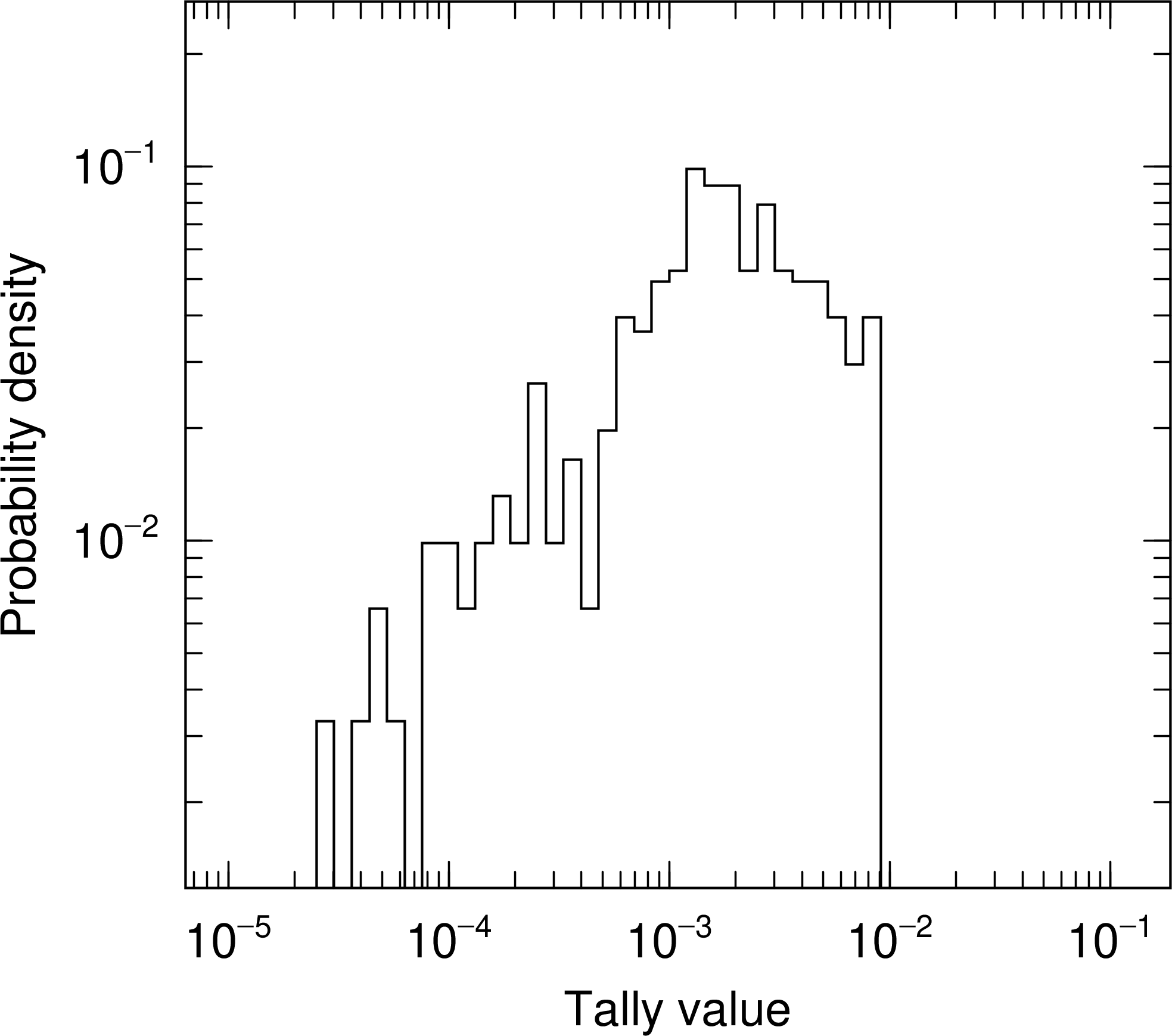 PDF の計算については、出力するタリー結果の範囲 \([x_{\rm min},x_{\rm max}]\) と対数スケールで分割する数 \(n_{\rm pdf}\) を決めておき、各ヒストリーのタリー結果 \(x_i\) が得られた時に、どのビン番号に入るかを調べ、そのビンのカウント数を増やしていきます。そして、最終的にその分布が積分して1となるように規格化したものを出力します。ここで、タリー結果が0の場合はカウントしないので、分布のピーク位置と平均値 \(\bar{x}\) がずれる場合があります。