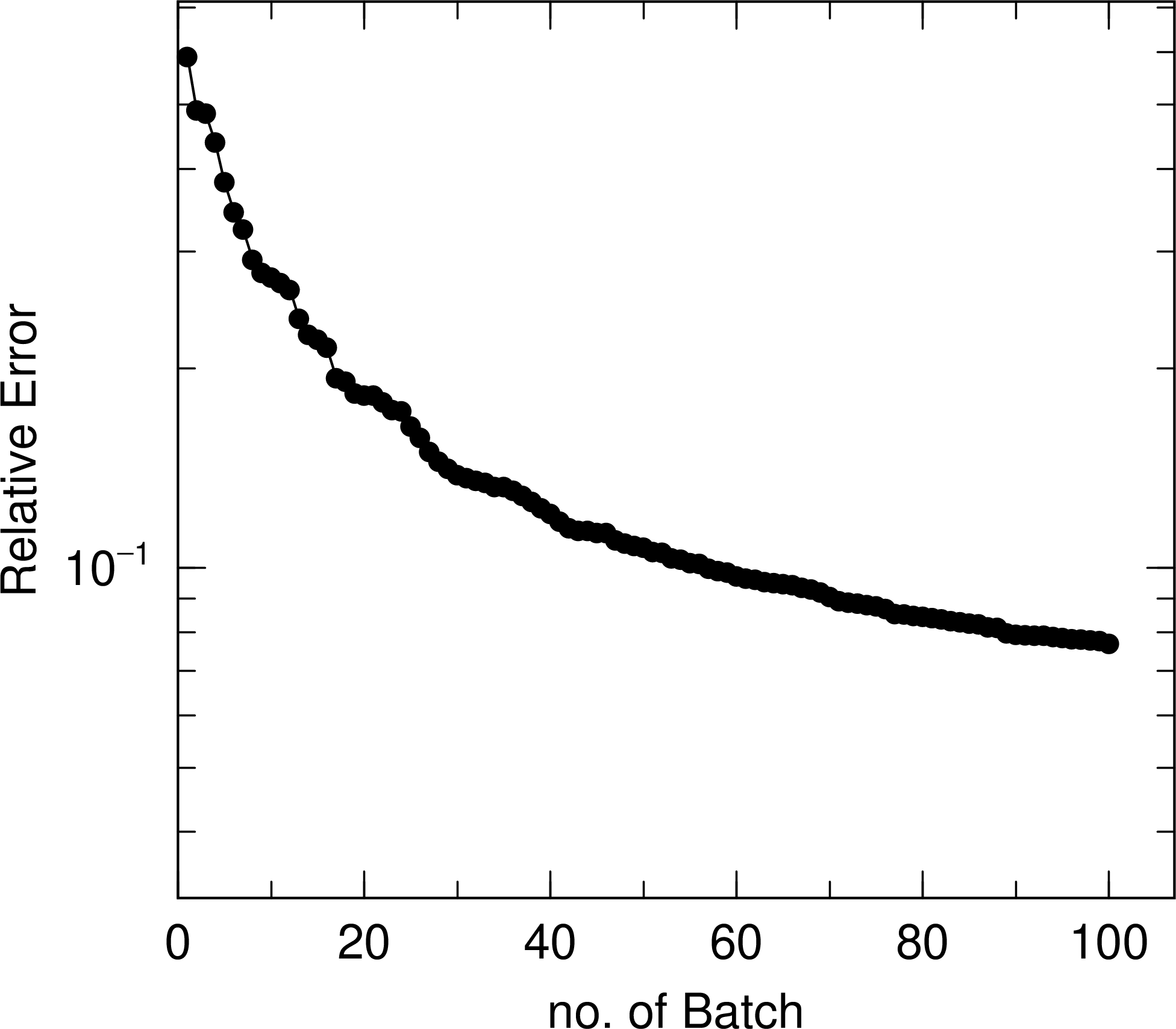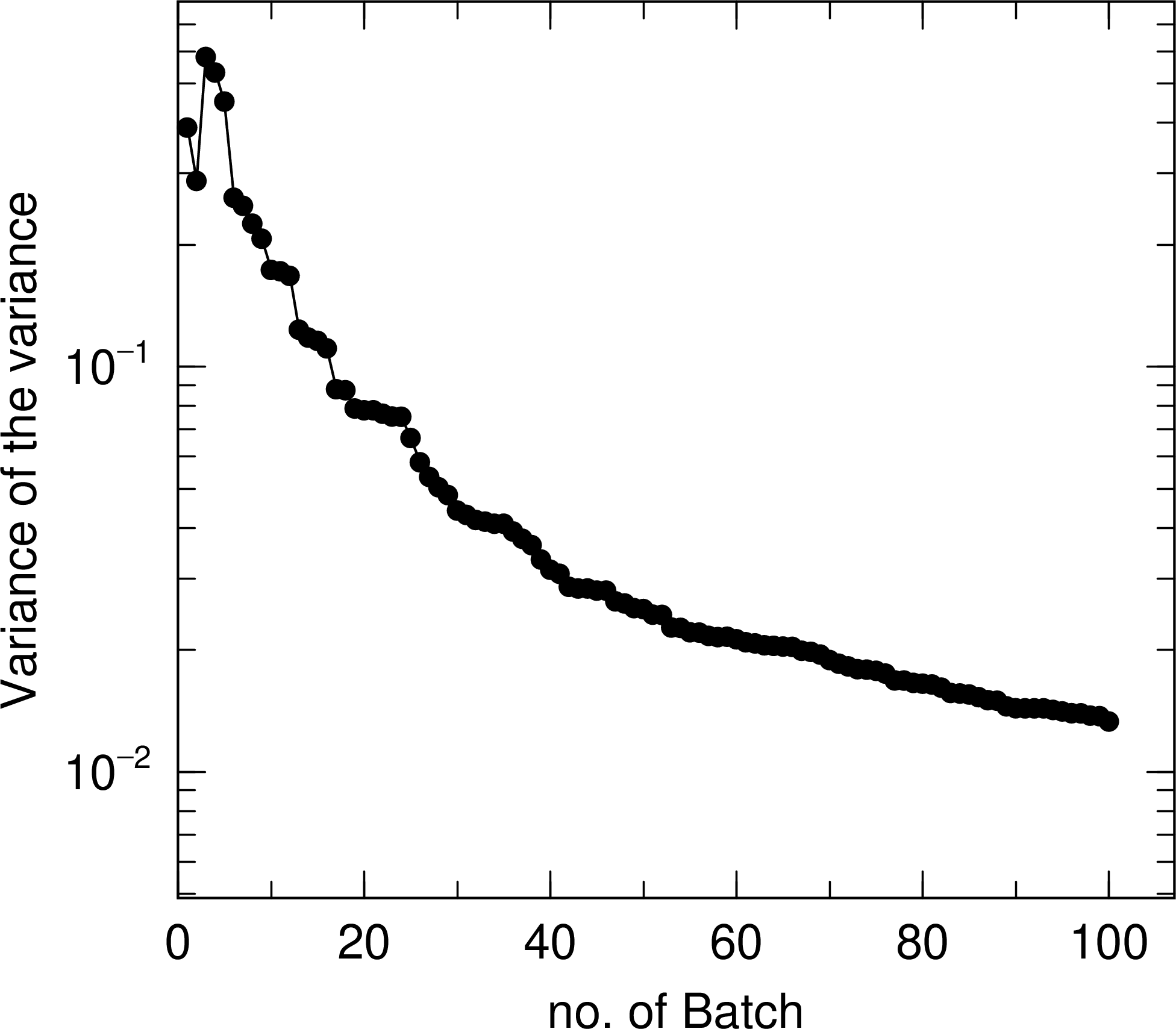 図 6.10.2 統計誤差の全ヒストリー数(全バッチ数)に対する推移。¶