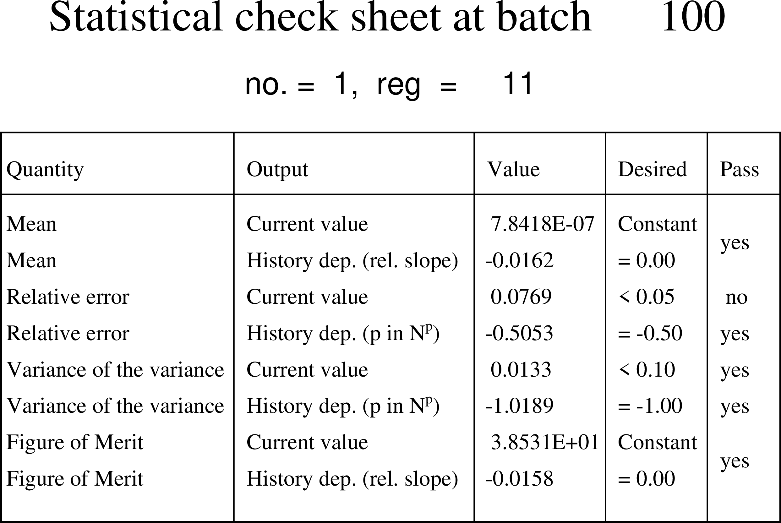 この check sheet では、平均値、統計誤差、分散の分散(VOV: variance of variance)、性能指数(FOM: figure of merit)に関するバッチ終了時の値(current value)と全ヒストリー数に対する依存性(history dep.)を出力し、統計的に信頼できる基準値と比較することで、合計6個のチェック項目について pass したかどうかを判定します。